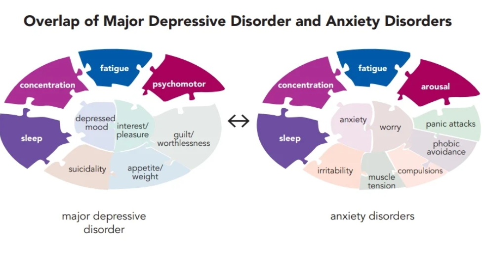 SSRIs and SNRIs and α2δ ligands, but NOT benzos. alch is risk here bc it works but bad idea. CBT can be strong