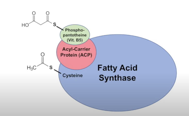 acetyl then binds to cys, and malonyl coa binds to ACP