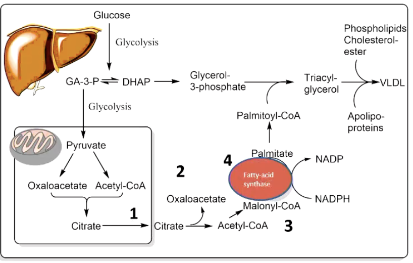 • Glycolysis/TCA supply cytosolic citrate ➜ ACC ON ➜ FAS active ➜ TAG synthesis & storage.