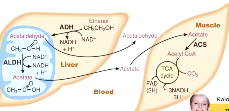 Acetaldehyde is then converted to acetate by acetaldehyde dehydrogenase (\text{Acetaldehyde}+NAD^+ \xrightarrow{\text{Acetaldehyde dehydrogenase}} \text{Acetate}+NADH+H^+), which can be used for energy in muscles.
