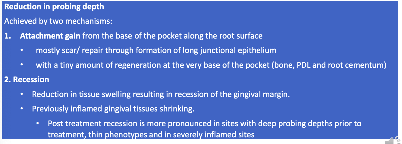 The pocket heals and reduces in depth by recession of the gingival tissue, formation of repair tissue (long junctional epithelium) and a small amount of regenerated PDL and bone in the most apical part of the pocket.
