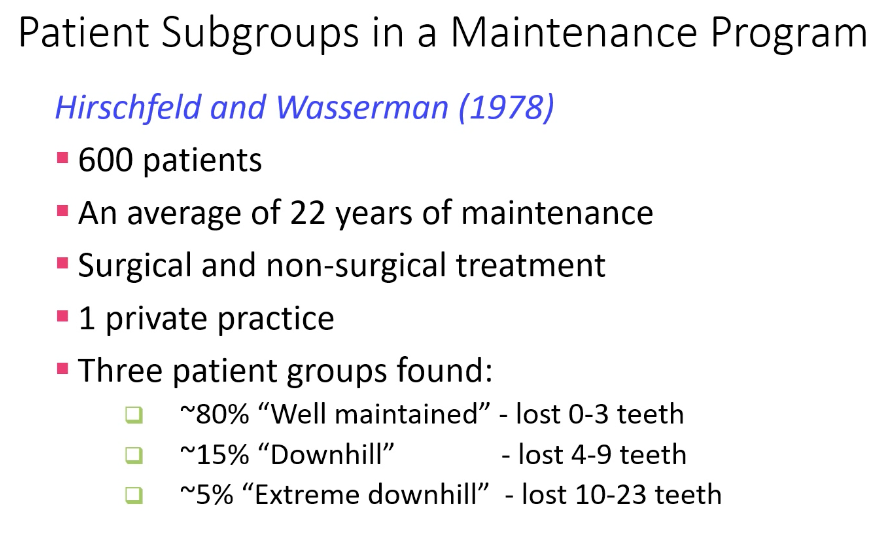 Observable results from long-term, retrospective trials of patients treated for periodontal disease (maintenance populations). Long-term maintenance studies include Hirschfeld and Wasserman (1978), and McFall (1982).