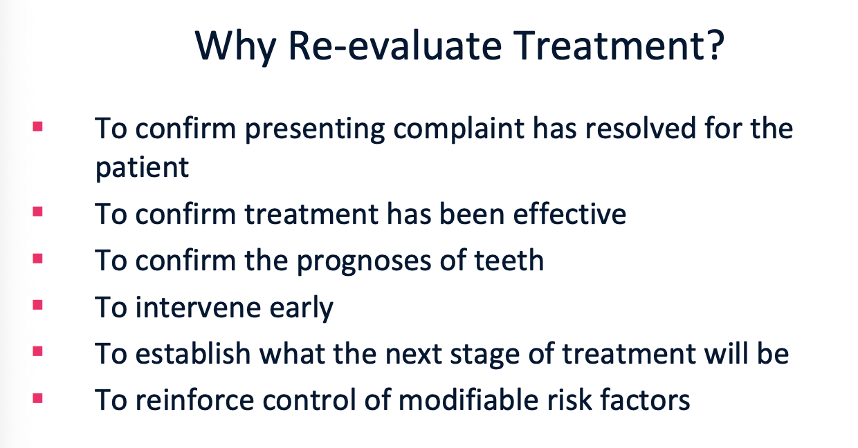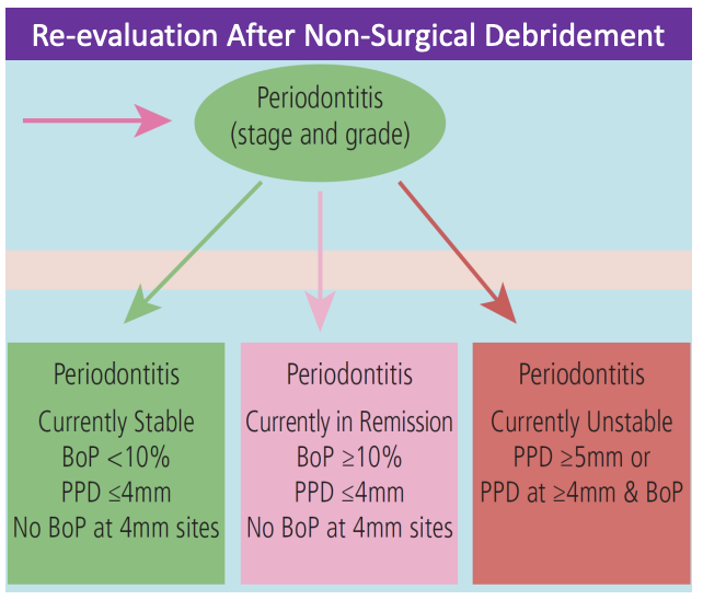 Periodontal re-evaluation identifies changes in periodontal parameters that occur after non-surgical debridement and also during the maintenance phase of periodontal treatment.