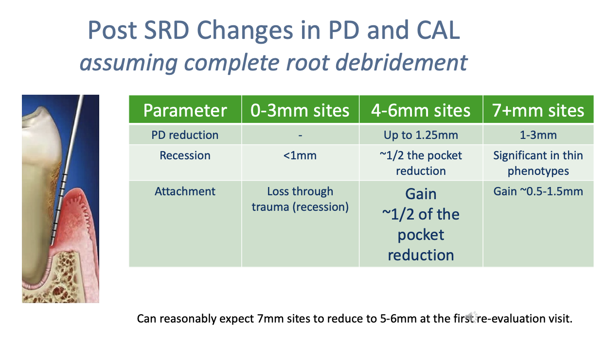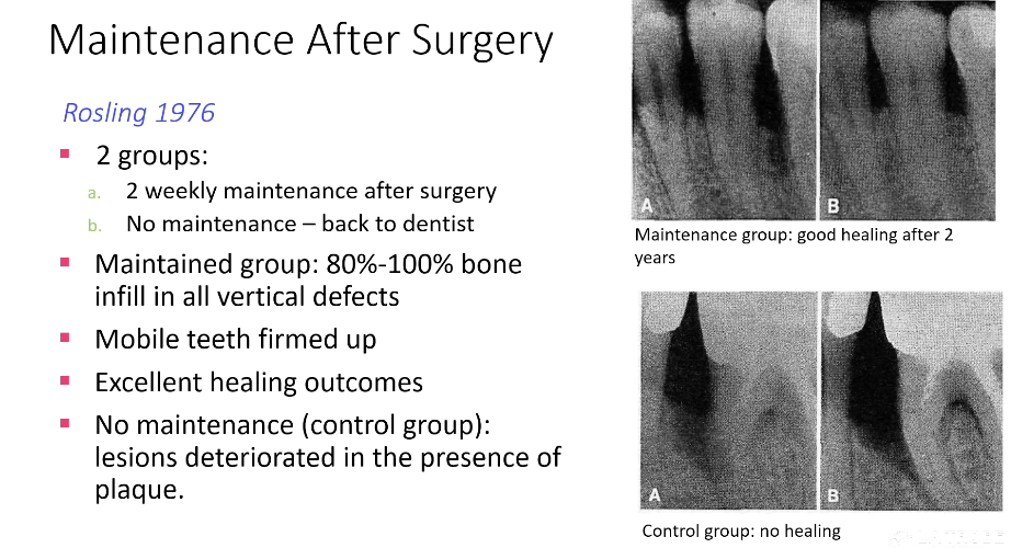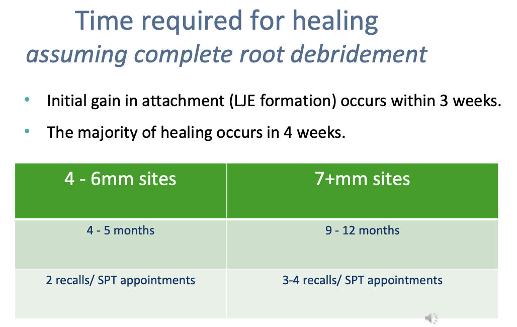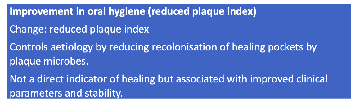 Excellent oral hygiene and SPT visits are required for good healing outcomes, irrespective of the type of periodontal therapy provided (i.e. nonsurgical or surgical).