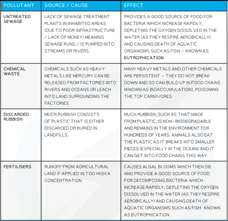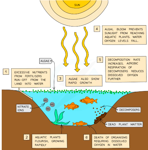 - Fertilisers with nitrates / detergents with phosphates leach into rivers and lakes after rain