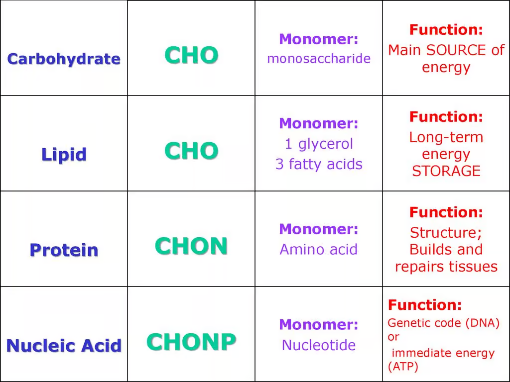 carbohydrates: polymers of sugar monomers; used to store energy (ex. starch) and provide structural support (ex. cellulose)