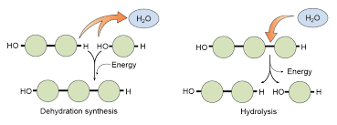 * dehydration synthesis: the creation of larger molecules from smaller monomers where a water molecule is released