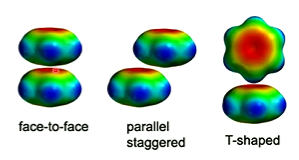Aromatic molecules can arrange themselves in a face-to-face, parallel staggered, or T-shaped orientation with the T-shaped orientation being the most favourable and the face-to-face orientation being the most unfavourable.