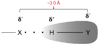 The hydrogen atom covalently bound to an electronegative atom interacts with another electronegative atom with a lone pair.
