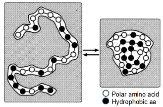 In the folded state, the polypeptide has a reduced surface area and H-bonds in bulk water are not disrupted so this is entropically favourable. Polar amino acid residues can also form hydrogen bonds with water molecules. Non-polar amino acid residues can form dispersion forces with each other within the core.