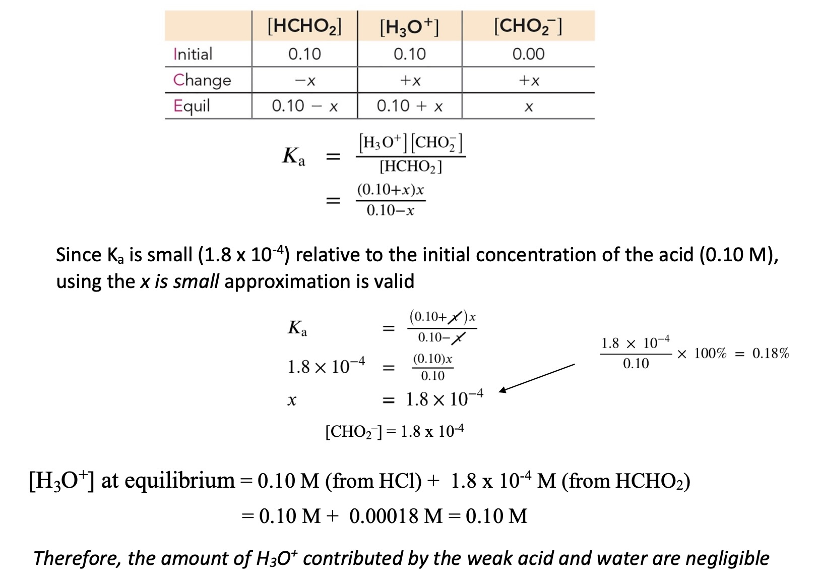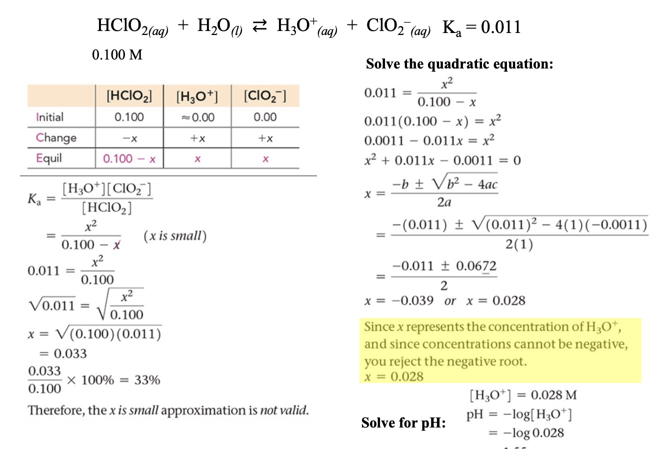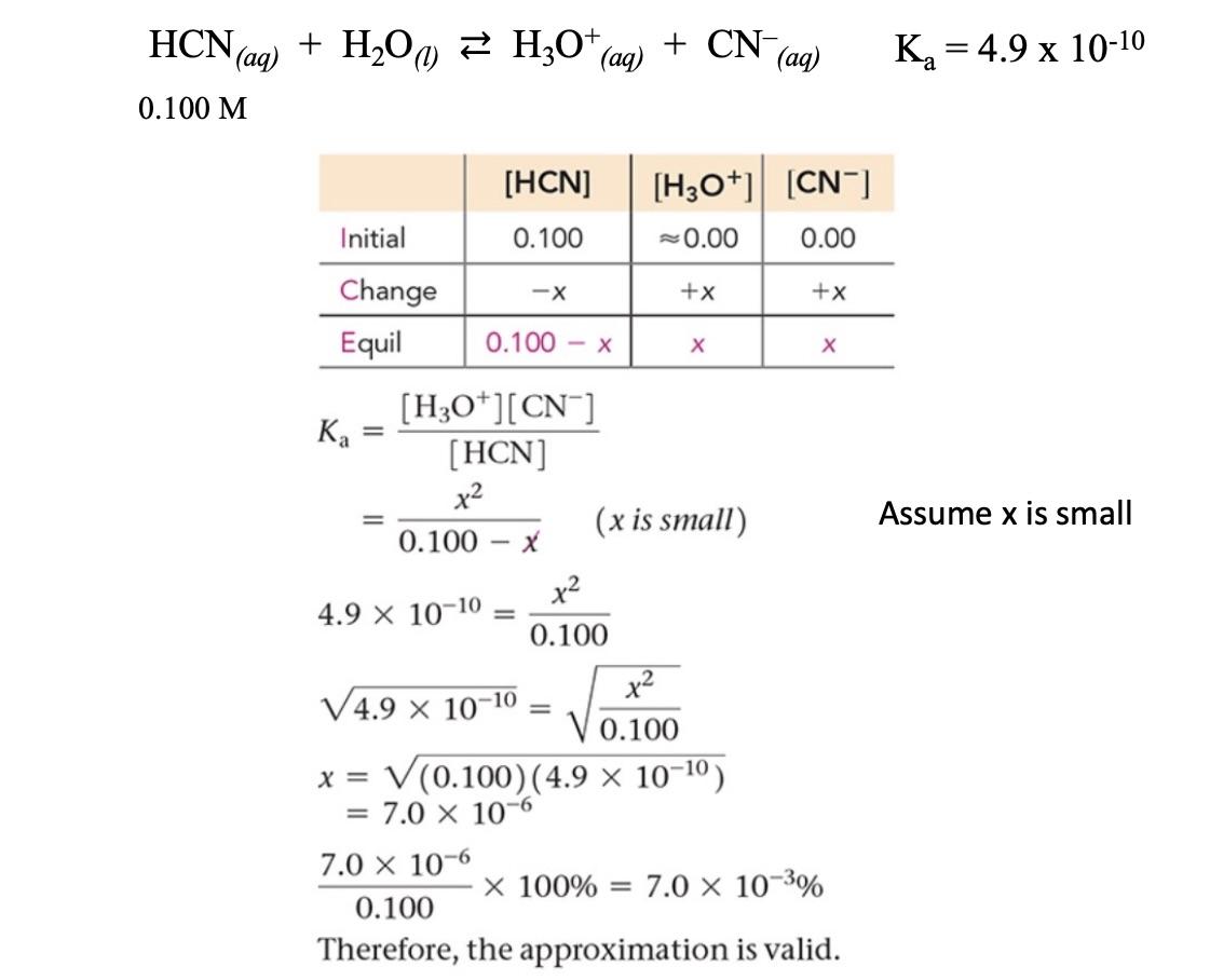 Solve for x using ICE table concept: use approximation if valid, or quadratic if needed.