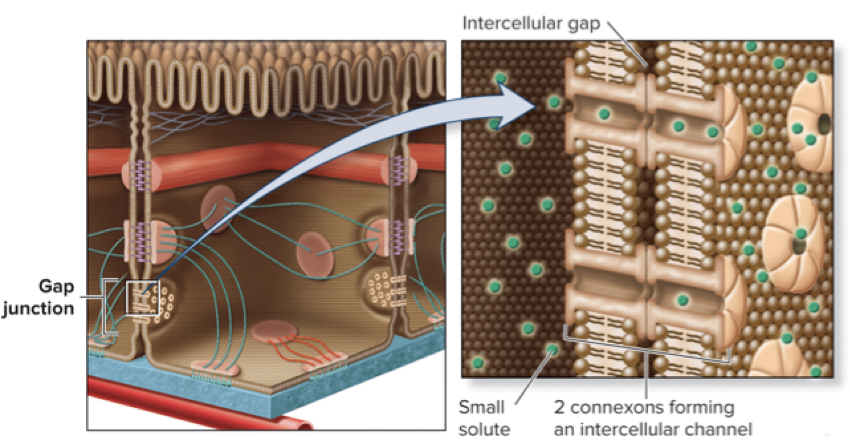 Gap junctions allow the passage of ions and small molecules (amino acids, sugars, and signaling molecules)