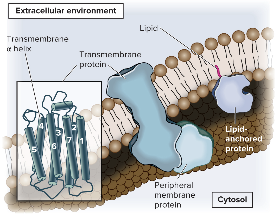 Proteins associate with membranes in three ways (transmembrane, lipid-anchored, and peripheral)