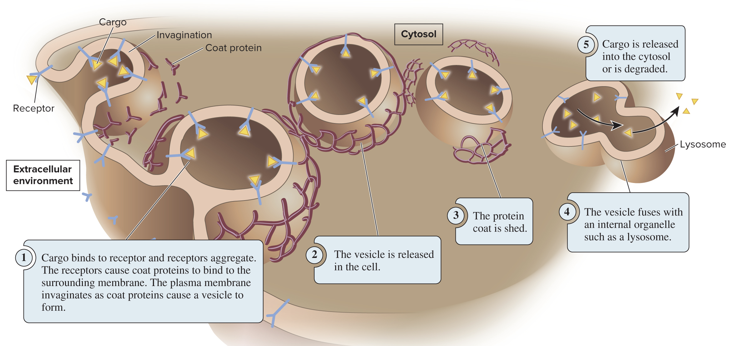 Receptor-mediated endocytosis (depicted below) uses receptor proteins to bring in specific cargo