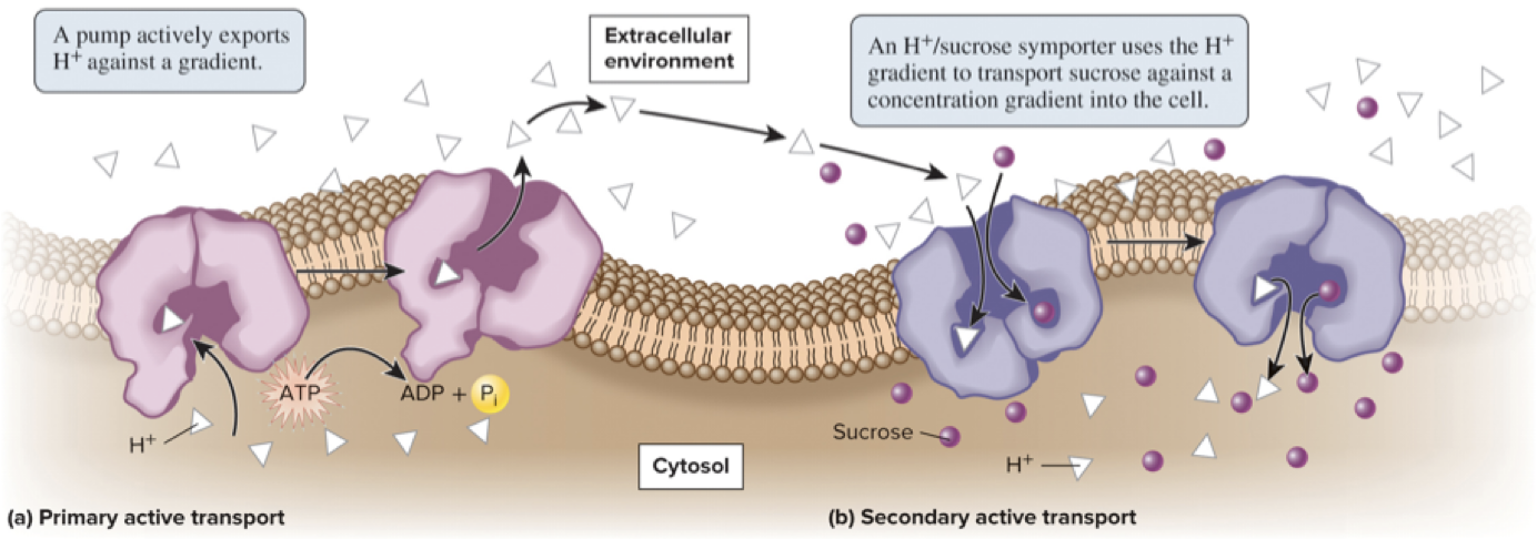 Secondary active transport concept: the energy of a pre-existing ion gradient drives import of another solute, e.g., \Delta G{gradient} + \Delta G{transport} < 0 for coupled transport (illustrated by H^+ gradient driving sucrose uptake via an H^+/sucrose symporter).