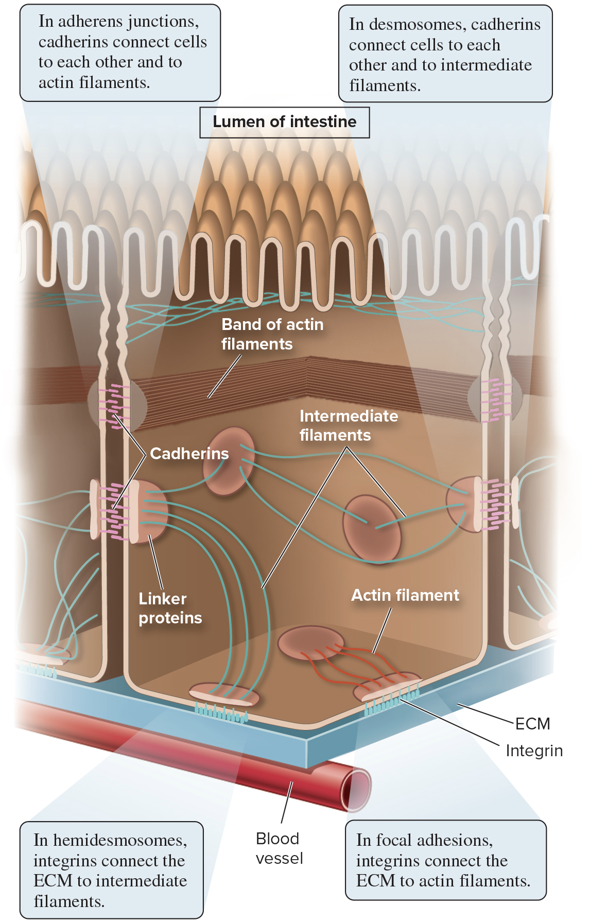 Anchoring junctions (adherens junctions, desmosomes, hemidesmosomes, and focal adhesions) link animal cells to each other and to the extracellular matrix