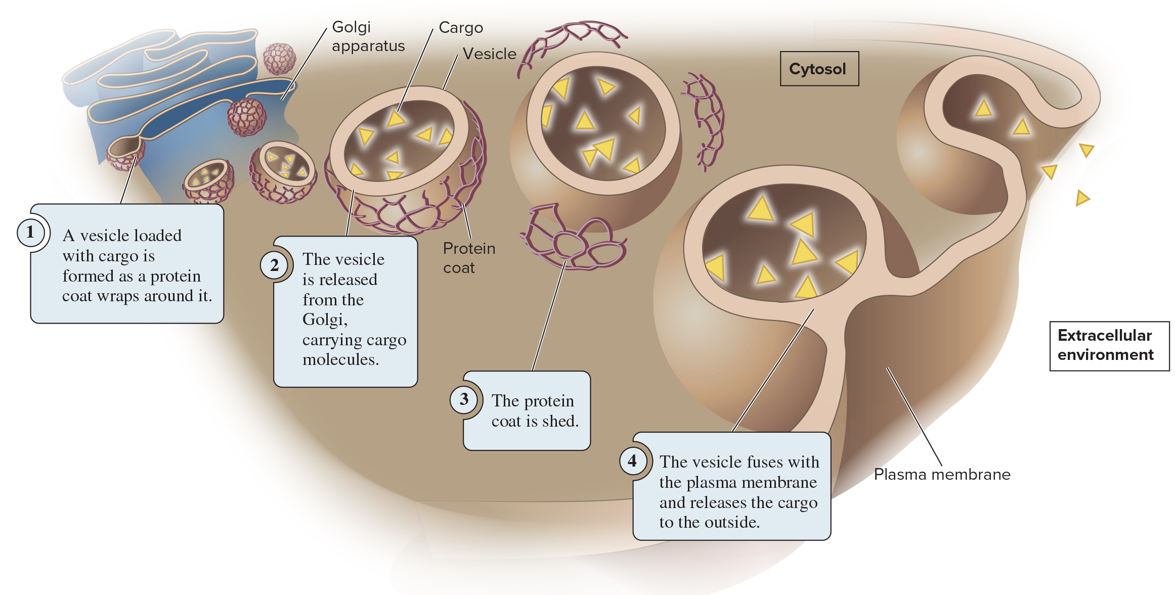 During exocytosis, materials inside the cell are packaged into vesicles and excreted to the extracellular environment
