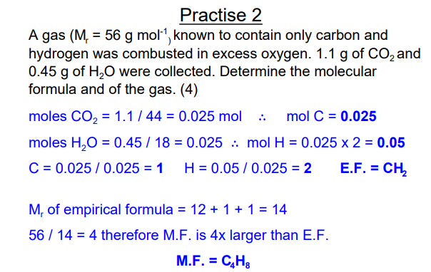 Step 1: Work out the Mr of the empirical formula: Mr(C3H7) = (3 x 12) + (7 x 1) = 43 g mol 1 Step 2: Divide the given molar mass by the Mr of the empirical formula: 86 / 43 = 2 This tells you how many times larger the molecular formula is than the empirical formula. Step 3: multiply the empirical formula by the answer from step 2 to get the molecular formula: 2 x C3H7 = C6H14