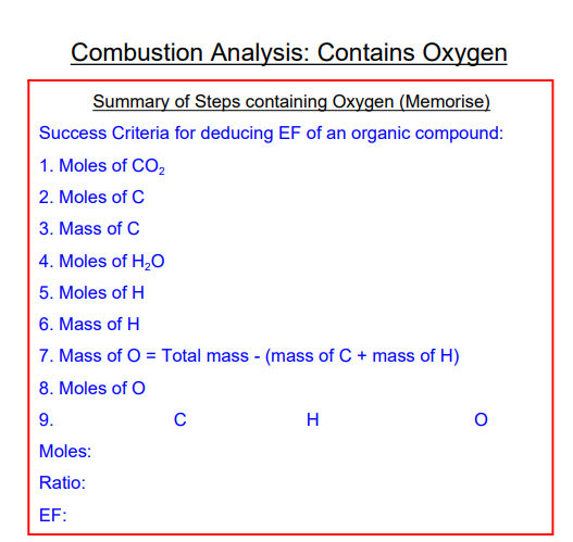 When a compound is completely burned, it is possible to collect and measure the masses of carbon dioxide and water formed. This allows us to work out the moles of carbon, hydrogen and oxygen (if present) in the original compound and therefore the empirical formula.