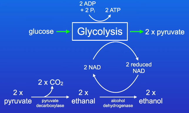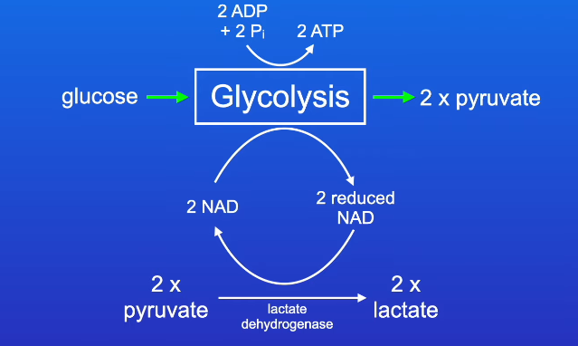 there is not enough NAD for glycolysis to take place, so the cell uses the reduced NAD produced by glycolysis to reduce the pyruvate to lactate/lactic acid: