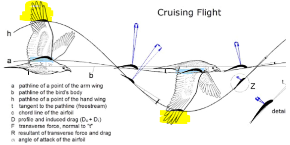 the wing tips (the primary feathers) are responsible for thrust and moving forward