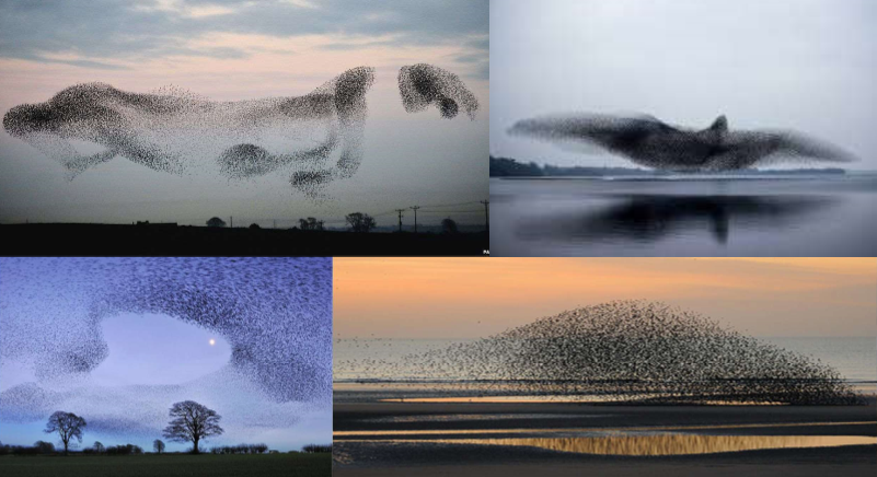 Murmurations→ Starling birds move together in large groups, function is unknown, is not just individual flying that is important