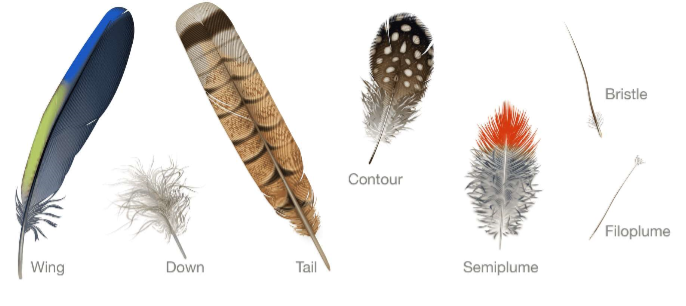 There are many types of feathers in extant birds e.g.: