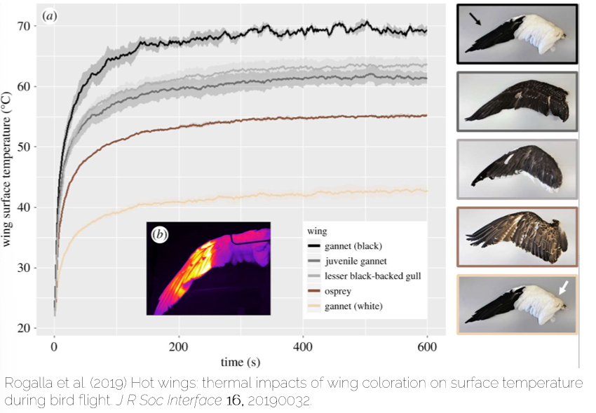 white feathers with black tips have a difference in temperature that creates a conductive current towards the tip to allow lift and help with flight