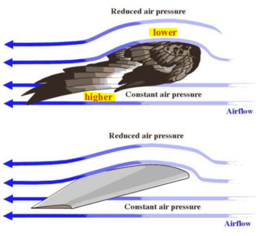 the top of the wing has a larger surface than the underwing