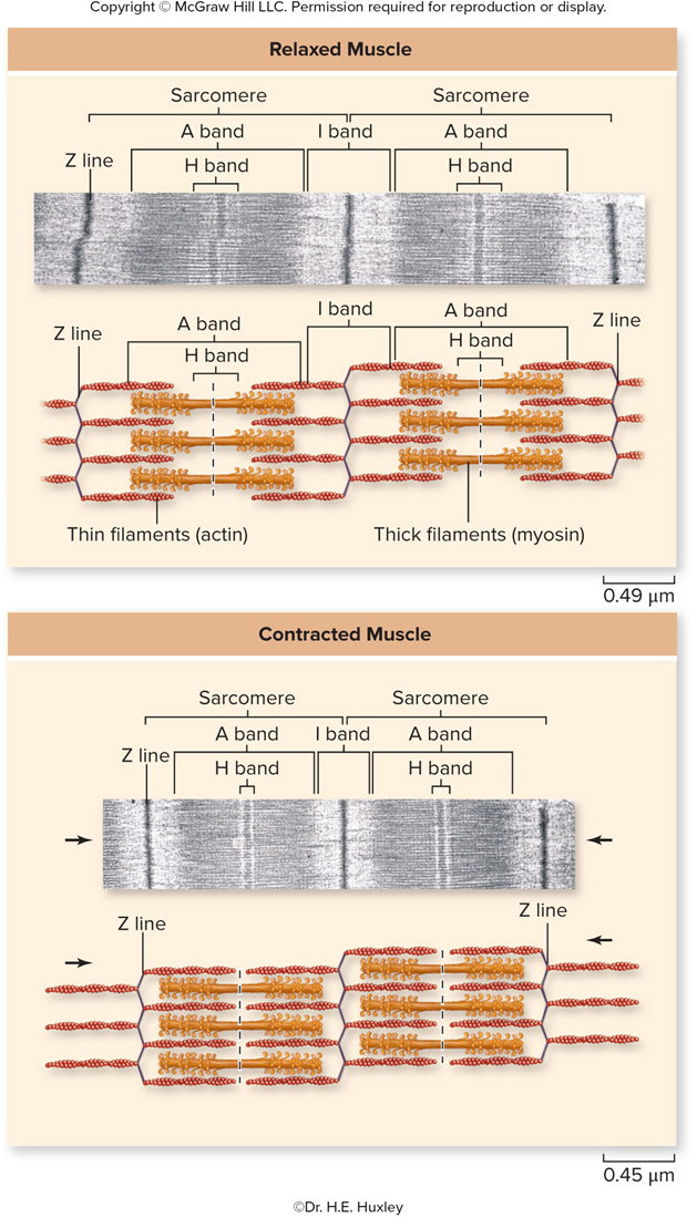 - The actin and myosin of the myofilaments are arranged into contractile units called sarcomeres which is what makes it look striated