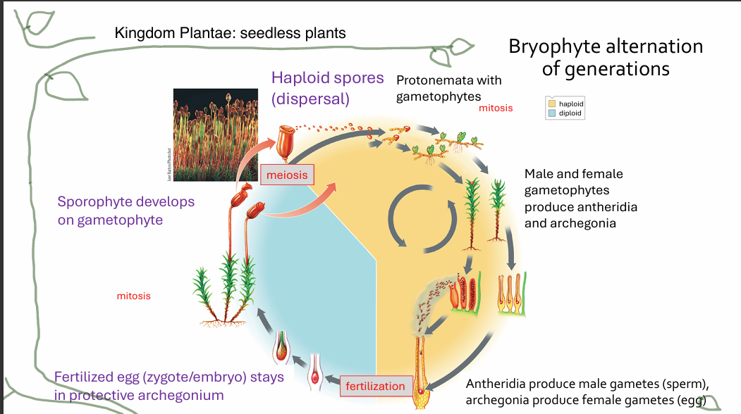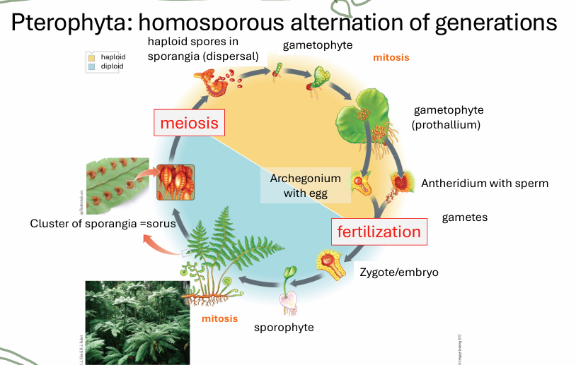Fertilization: Involves male gametophyte (producing antheridia for sperm) and female gametophyte (producing archegonia for eggs).