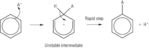 because of the delocalised electrons above and below the ring, the electron density between any two adjacent carbon atoms is less than in the double bond in alkenes because of this benzene cannot polarise a bromine molecule and induce a dipole
