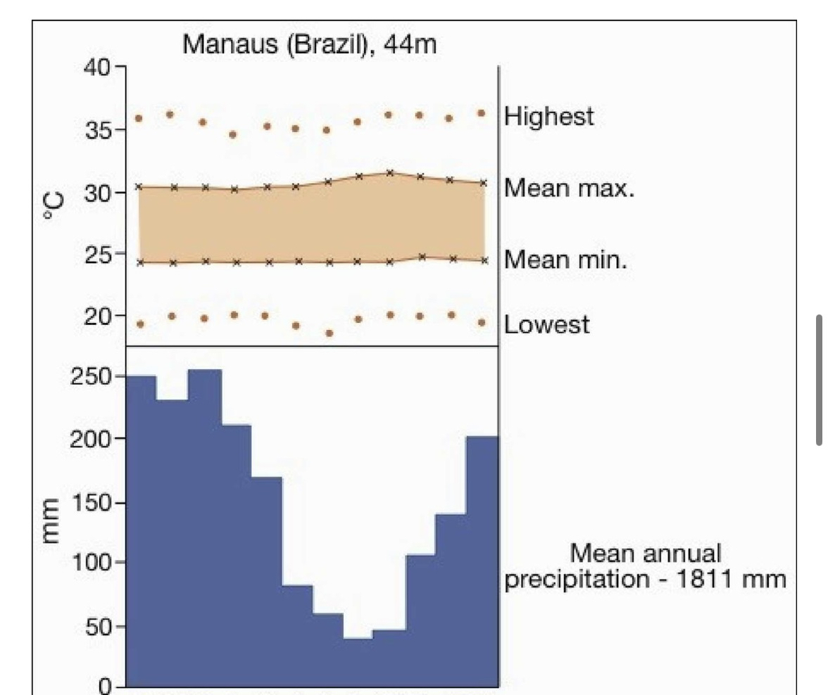 large trees have shallow root systems evolved to be able to quickly absorb nutrients as soon as they become available (rapid decay of dead things), before the rains wash them away.