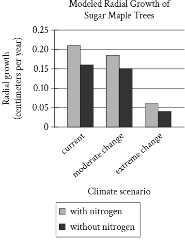 Inés Ibáñez and colleagues studied a forest site in which some sugar maple trees receive periodic fertilization with nitrogen to mimic the broader trend of increasing anthropogenic nitrogen deposition in soil. Ibáñez and colleagues modeled the radial growth of the trees with and without nitrogen fertilization under three different climate scenarios (the current climate, moderate change, and extreme change). Although they found that climate change would negatively affect growth, they concluded that anthropogenic nitrogen deposition could more than offset that effect provided that change is moderate rather than extreme.