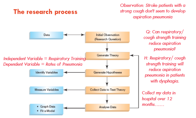@@Example of experimental research@@: Elderly nursing home residents are assigned to a control group (sham training) and an experimental group (respiratory muscle training). The speech pathology researchers compare cough peak flow measurements in each group after 4 weeks.