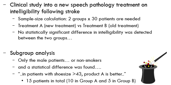 Commonly used tricks occur may happen during a sub-group analysis.. For example, identifying a statistical difference in a certain group. If you plan to do sub-group analysis.. you must specify this in your research plan “a priori”. Examples include: