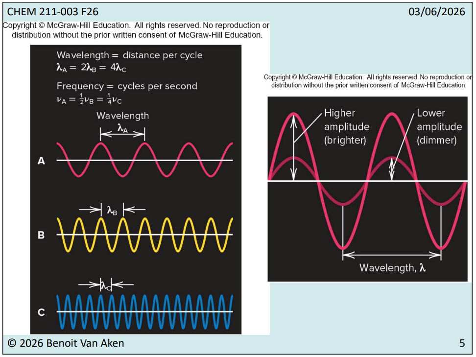 Wavelength: Distance a wave travels in one cycle (unit = meters-m, nanometers-nm, etc.)