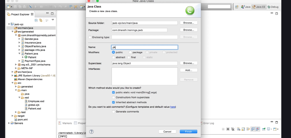 ex. JAXBContext context = JAXBContext.newInstance(XYZClass.class);Next create a Marshaller → context.createMarshaller();