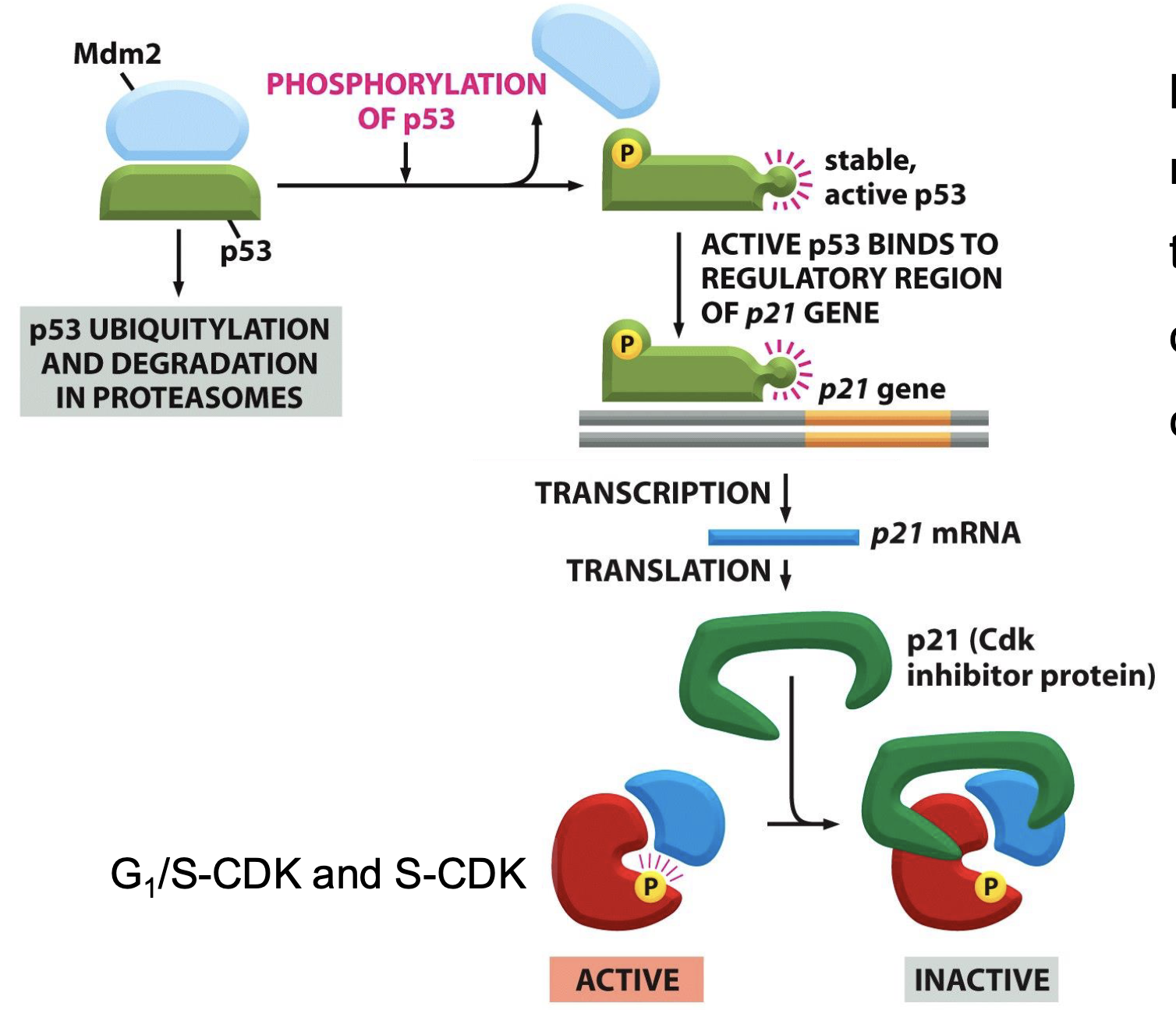 p53 binds to promoter region of p21 gene - triggering transcription and translation to produce p21 protein