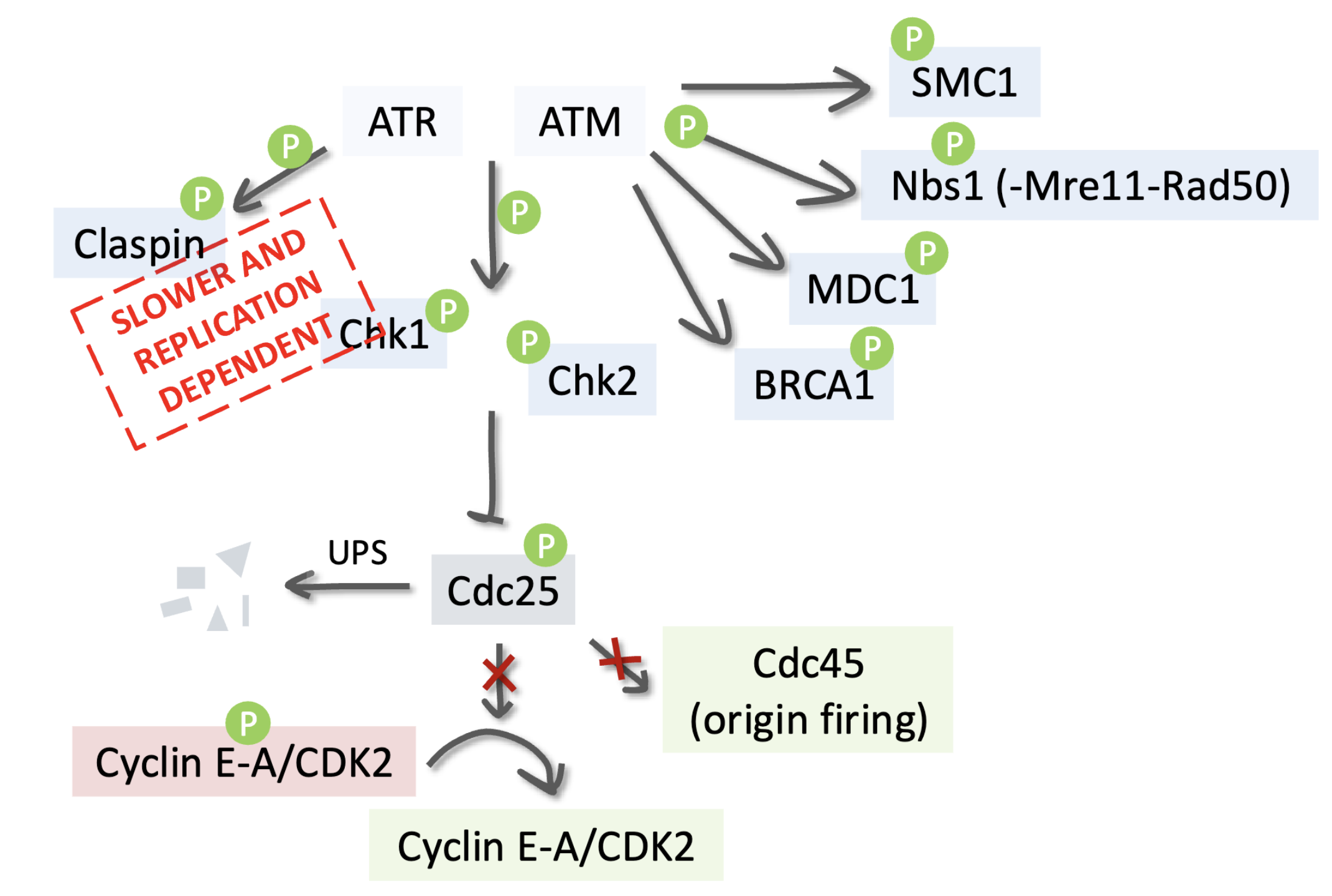 Both Chk1 (via ATR) and Chk2 (via ATM) phosphorylate and inhibit Cdc25, inhibiting Cyclin E/A–CDK2 activity to block DNA synthesis/S-phase progression, also inhibiting origin firing (Cdc45) which prevents new replication forks from starting while damage is unresolved