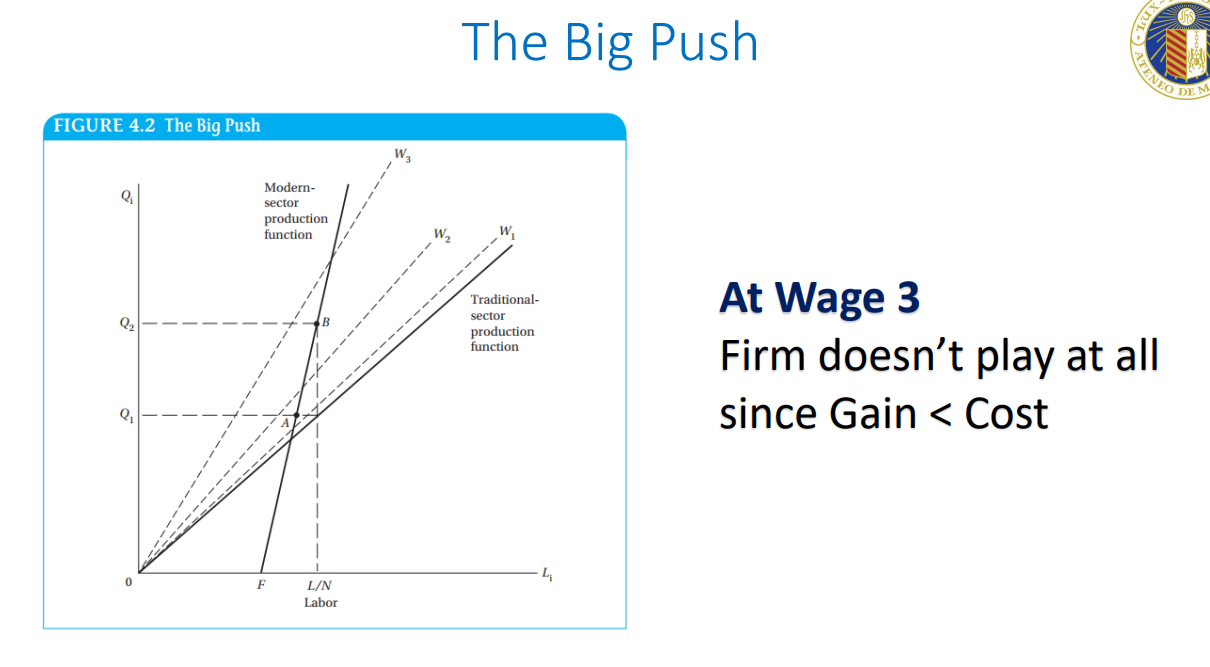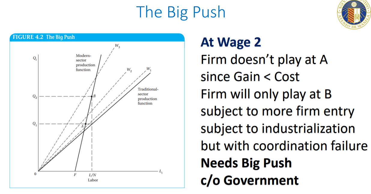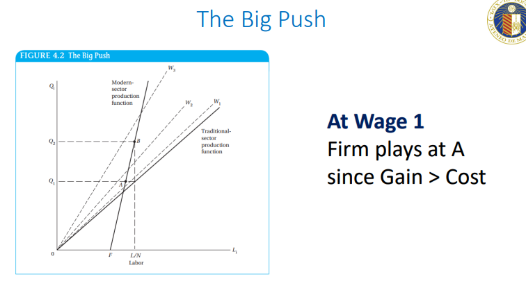 Pecuniary externalities associated with the development process → multiple equilibria → big push policy