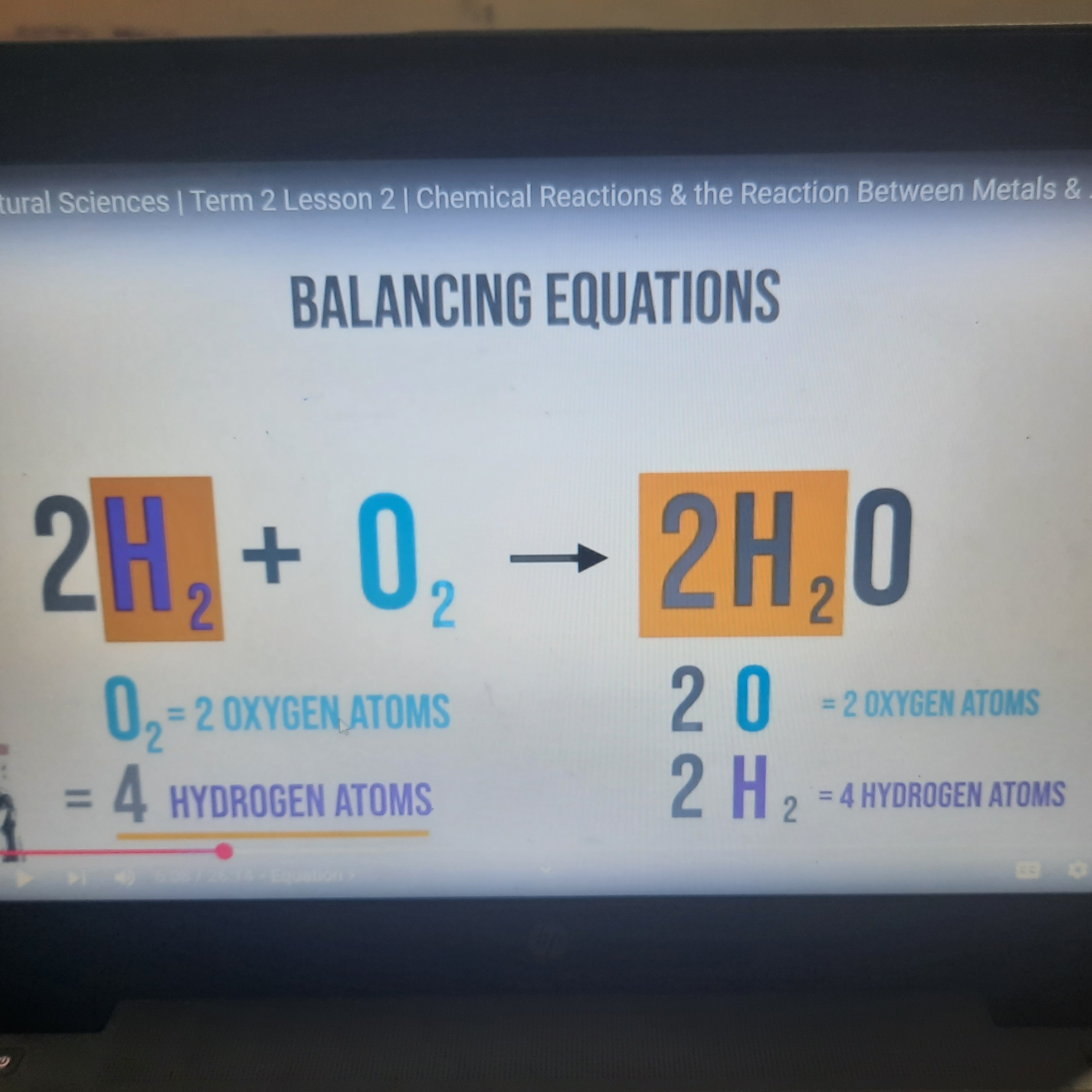 2×2 results in 4 hydrogen atoms on the right hand side, with only 2 hydrogen atoms on the left hand side to counteract this change I just now add a big 2 on the left hand side.