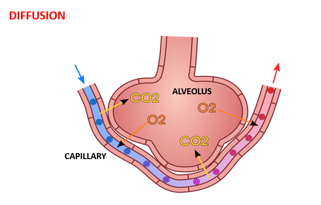 The gradient of concentration drives the movement of O₂ from the alveolus into the blood (capillary), while CO₂ moves from the blood into the alveolus to be expelled from the body.