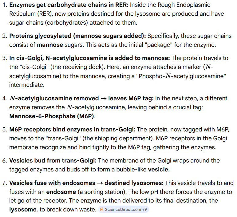 From the cell's internal "factory": Small sacs (vesicles) carrying special breakdown chemicals (enzymes with M6P) come from the Golgi apparatus.