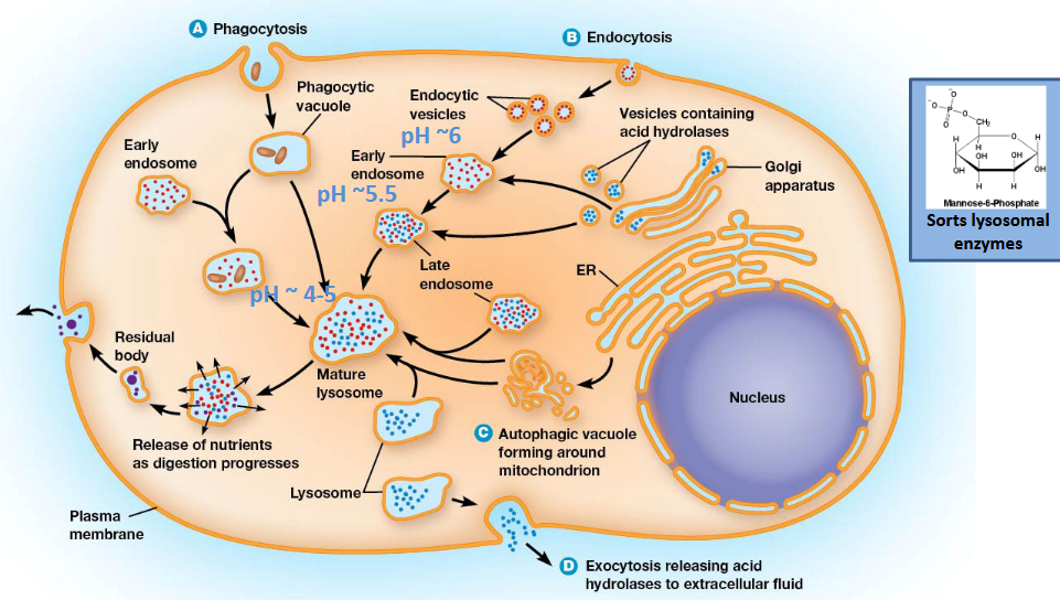 Final step: The late endosome becomes even more acidic, finally turning into a mature, working lysosome.