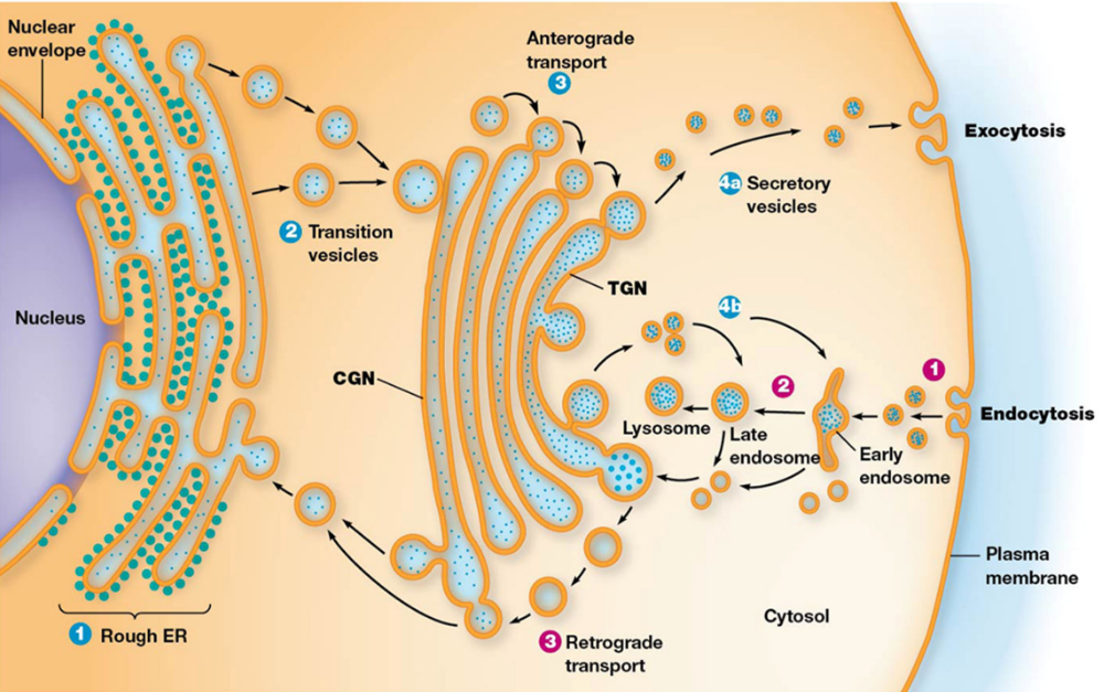 Retrograde Transport is the movement back toward ER. Plasma membrane → inside (endocytosis) → Golgi → ER