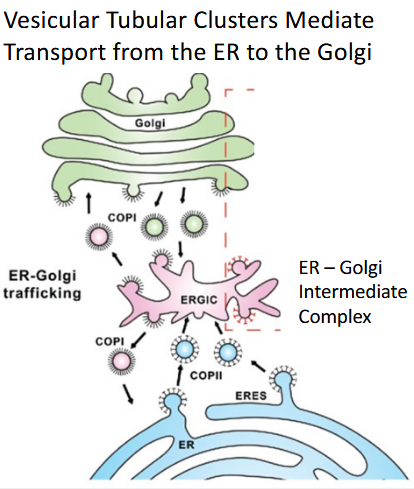COPII: These proteins help move items from the endoplasmic reticulum (ER) to the Golgi apparatus. This is an "anterograde" (forward) direction of transport.