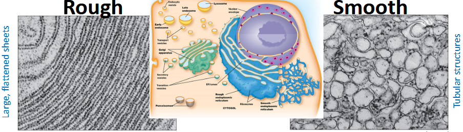 Characterized by flat membrane sheets with attached ribosomes that give it a “rough” appearance.