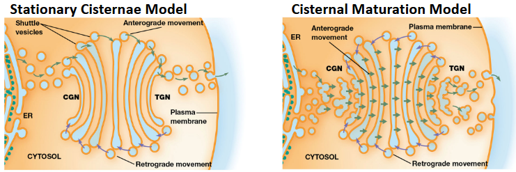 Cisternal Maturation Model: Cisternae themselves move through the Golgi, changing their functions as they mature. Enzymes are recycled backward