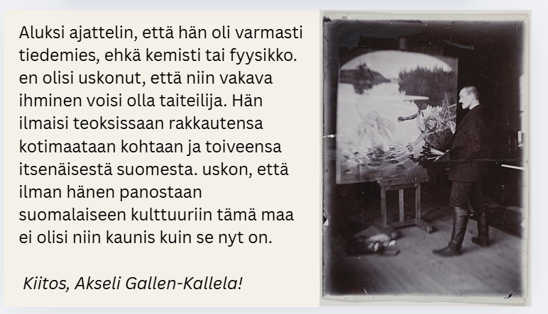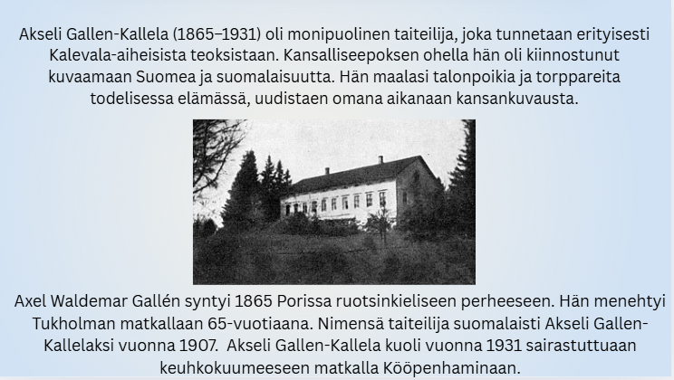 Tänään haluan kertoa teille suomalaisesta taiteilijasta, Akseli Gallen-Kallelasta. Hän eli vuosina 1865 (tuhatta kahdeksansataa kuusikymmentä viisi)–1931 (tuhatta yhdeksansataa kolmekymmentä yksi) ja oli erittäin monipuolinen taiteilija. Hänet tunnetaan erityisesti Kalevalan aiheita kuvaavista teoksista. Gallen-Kallela oli kiinnostunut suomalaisuudesta ja halusi kuvata kansan elämää realistisesti. Hän maalasi talonpoikia ja torppareita ja toi uutta näkökulmaa siihen, miten tavallisia ihmisiä esitettiin taiteessa.